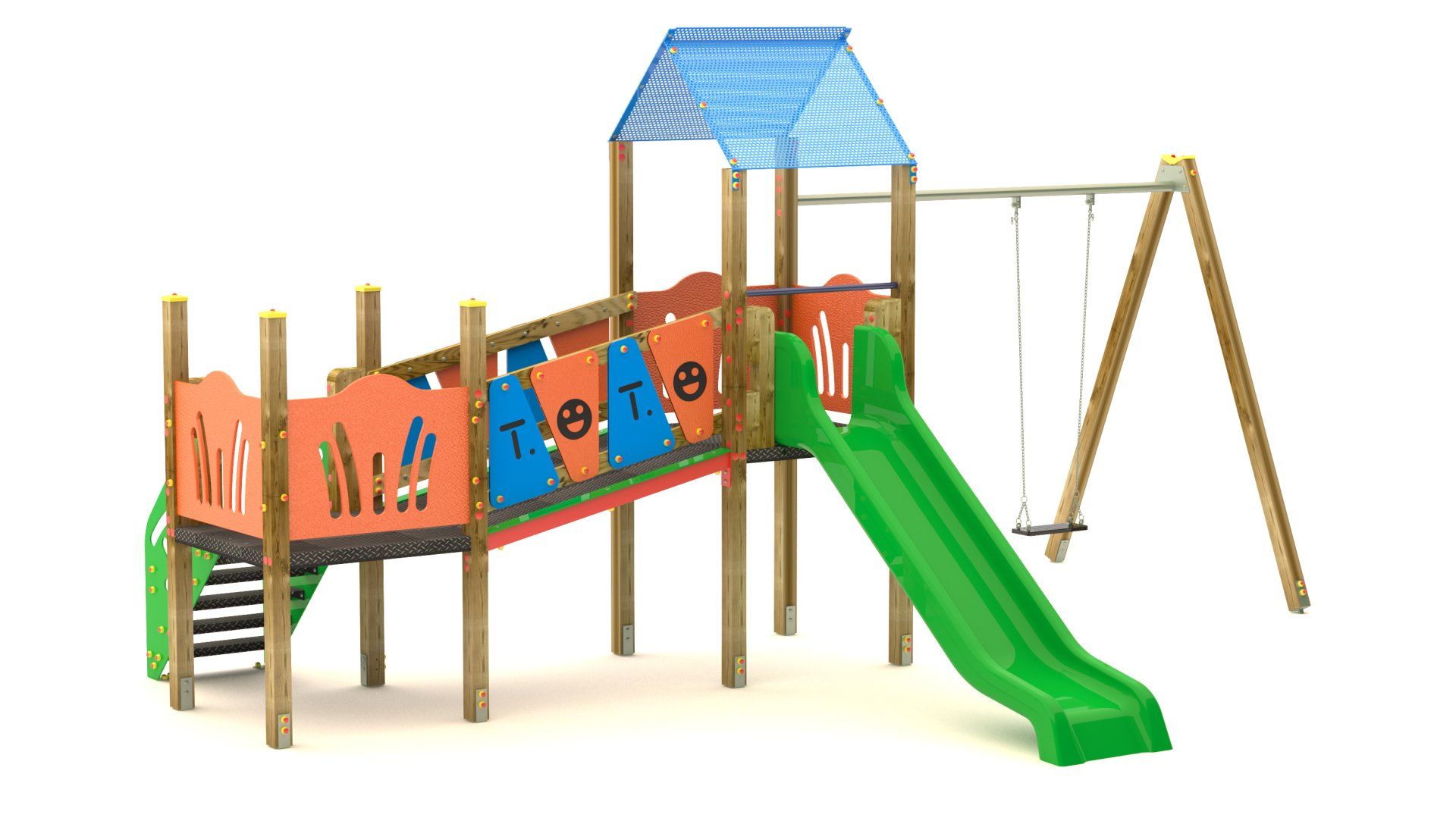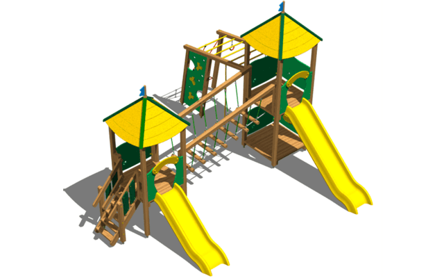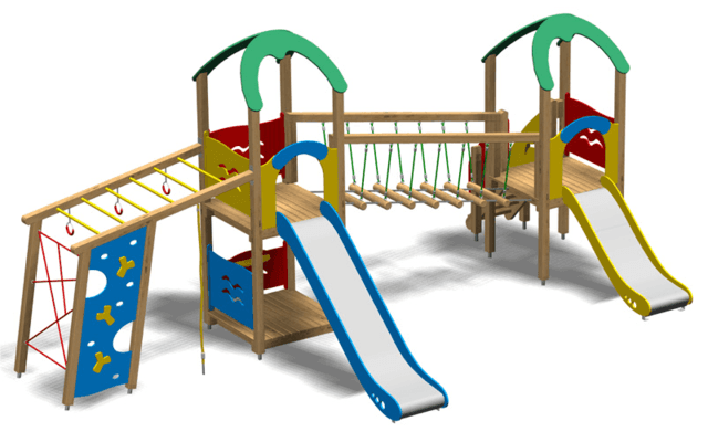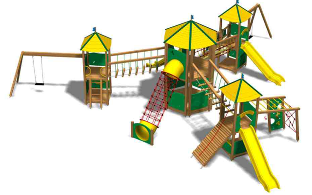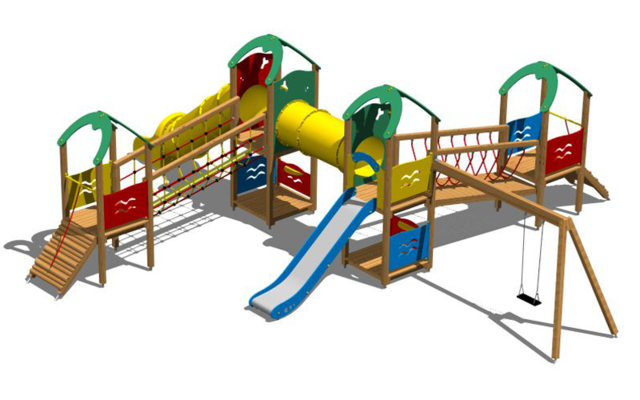 Lo studio di progettazione è in grado di realizzare diversi giochi com scivoli, percorsi sospesi, altalene e recinti con varie forme per divertire bambini di tutte le età.