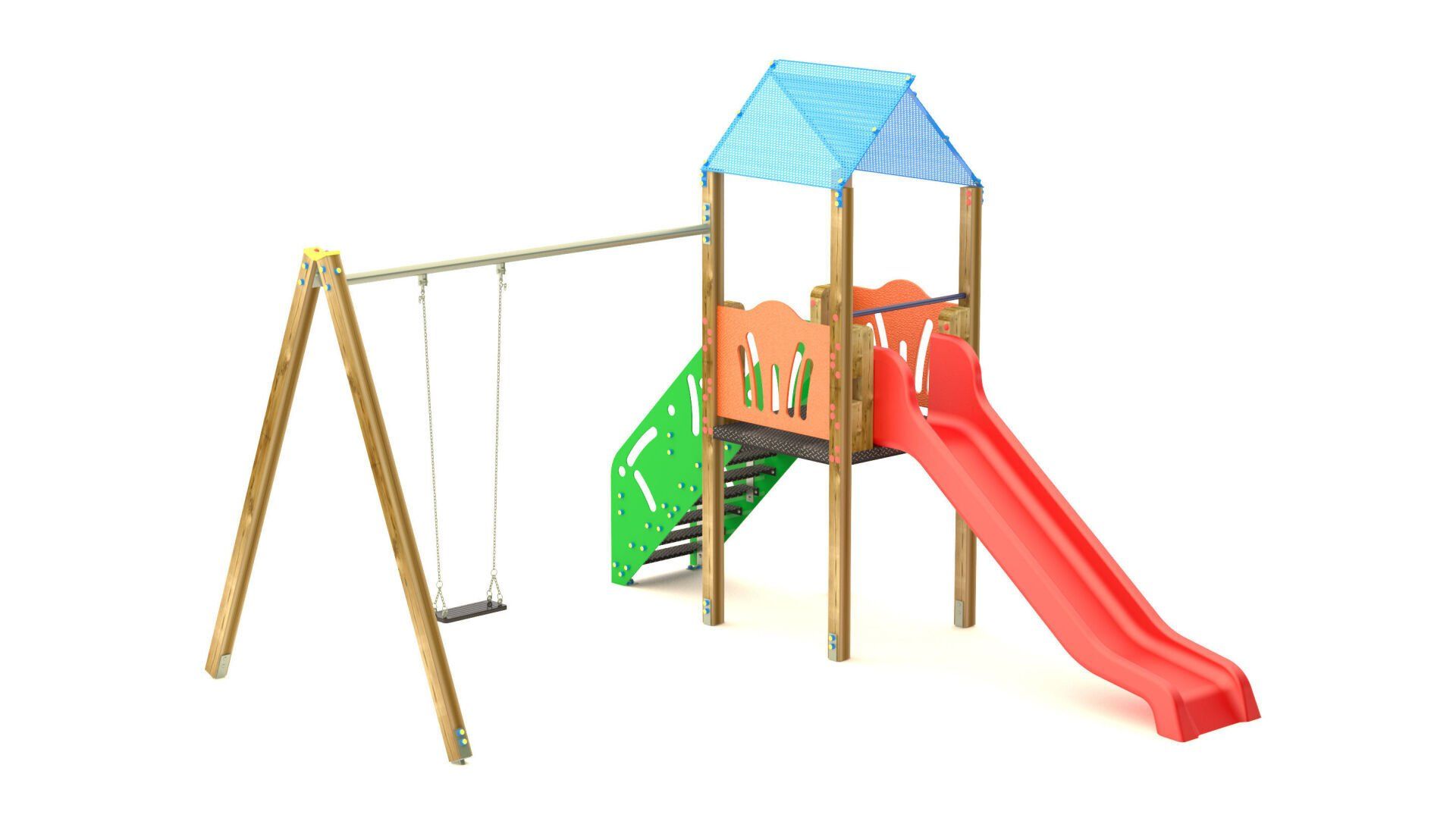 La società romana propone aree attrezzate per bambini robuste e resistenti come scivoli da giardino, giochi su molla, altalene doppie, singole e per bambini di ogni età, percorsi avventura e casette d'arredo.